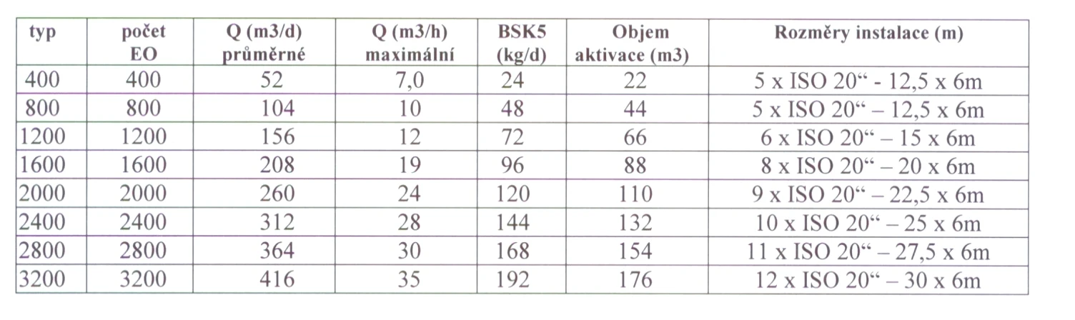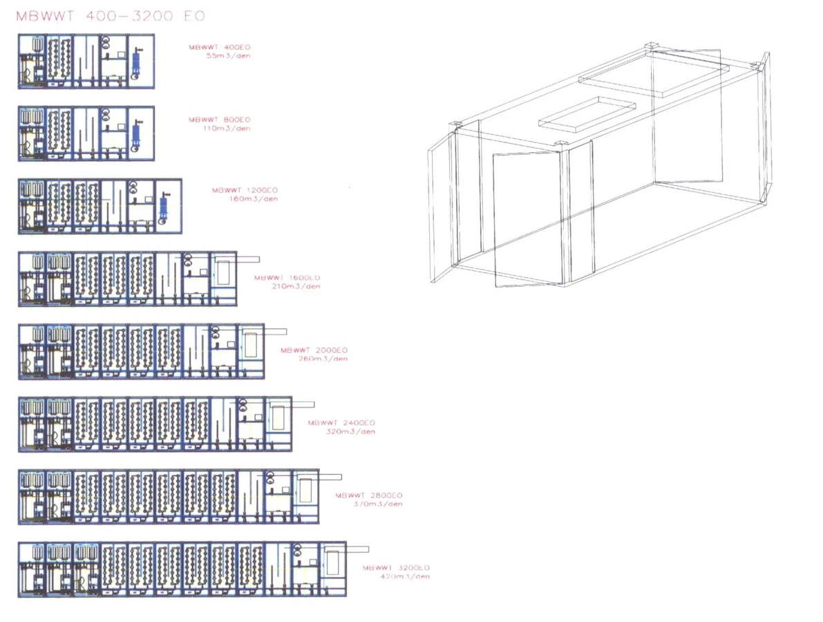 Nová řada biologických čistíren MBWWT se vyznačuje proto lehkou nadzemní stavbou složenou z kontejnerů ISO20 upravených a vybavených potřebnou technologií.